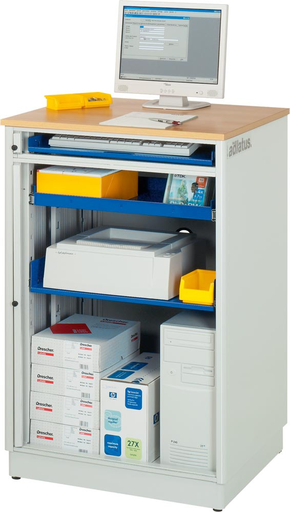 ∙ Buche-Dekor-Arbeitsplatte 25 mm stark, mit gerundeten Ecken und Kanten sowie einem Kabeldurchlass mit Abdeckplatte ∙ Das Unterbaugehäuse ist geteilt und verfügt sowohl im oberen als auch im unteren Bereich über einen jeweils separat zu öffnenden und abschließbaren Rollladen sowie eine 4-fach Energieversorgung inklusive Zuleitung und Kabeldurchlass an der Gehäuserückseite ∙ Oberer Bereich mit ausziehbarer Tastaturschublade BxT 350 x 590 mm, inklusive links oder rechts ausziehbarer Mausauflage BxT 350 x 250 mm ∙ Unterer Bereich mit Ausziehschublade, Auszugboden und Ablageboden - Ausziehschublade und Auszugsboden sind in der Höhe verstellbar ∙ Wahlweise stationär mit verstellbaren Füßen zum Ausgleichen von Bodenunebenheiten oder fahrbar mit 2 Lenk- und 2 Bockrollen ∙ Optional mit Monitorgehäuse lieferbar (Beschreibung siehe unten) ∙ Umweltfreundliche Pulverbeschichtung: Gehäuse RAL 7035 lichtgrau, Einbauten RAL 5010 enzianblau