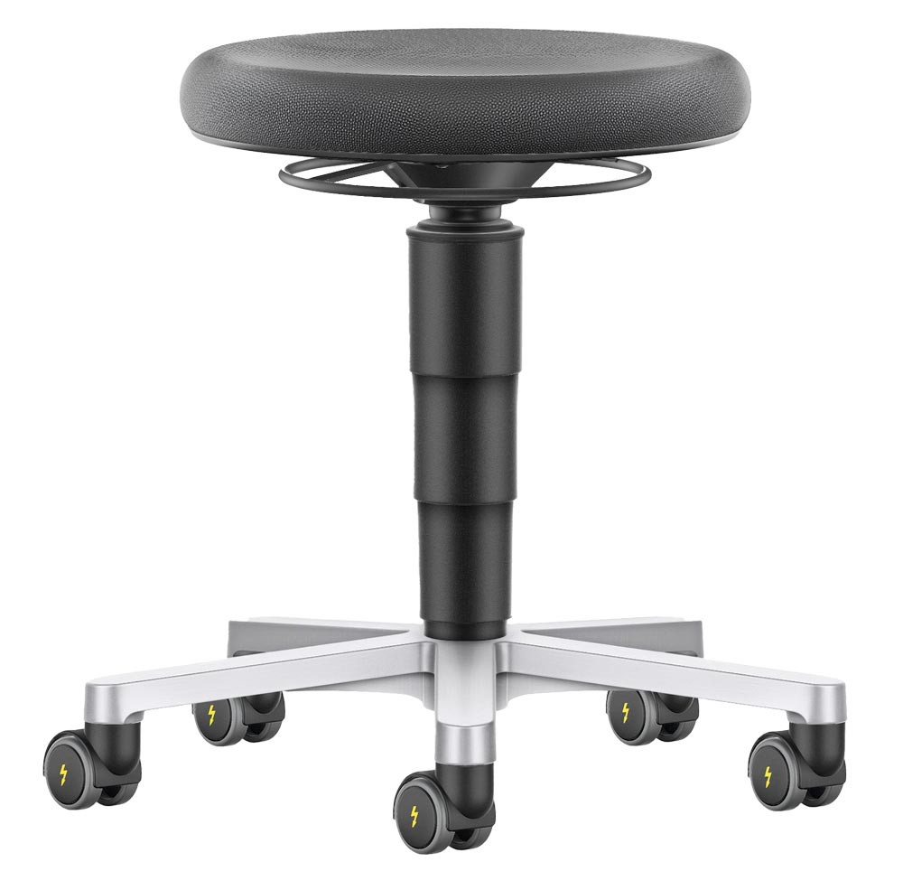 · Sehr großer Sitzhöhenverstellbereich · Höhenverstellung durch Ringauslösung · Fugenarm, leicht zu reinigen, desinfizierbar · Fußkreuz aus Aluminium Ø 540 mm · Platzsparend und leicht mobil · Für Industrie, Dienstleistungen und Labor · Schwarzer Farbring zum Schutz der Polster · ESD-konform nach EN 61340-5-1