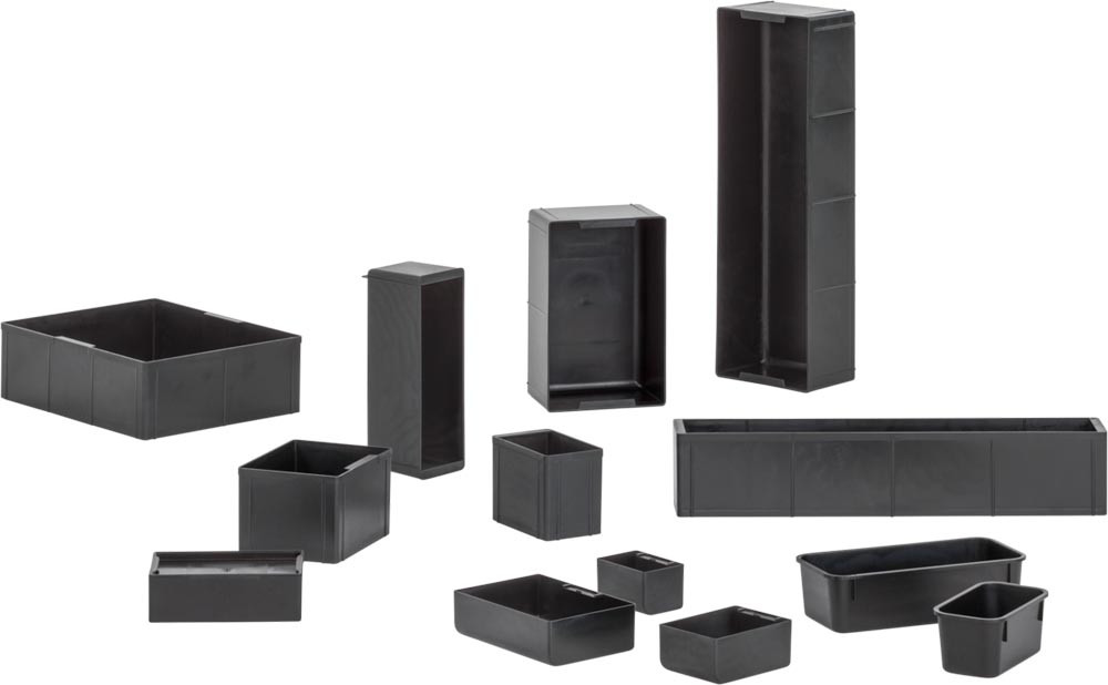 · Die unterschiedlichen Größen ermöglichen Ihnen eine individuelle, optimale Bestückung des Stapelbehälters nach Ihren Bedürfnissen · Gleichermaßen sind sie auch bestens geeignet als lose Kleinteilebehälter · Kompatibel mit Euro-Norm und SGL-Norm Stapelbehältern · Mühelose Entnahme des Inhalts · Gute Gleiteigenschaften auf Fertigungsrutschen · Als lose Kleinteilebehälter verwendbar, schachtelbar · Temperaturbeständig von -20 °C bis +80 °C · Farbe schwarz