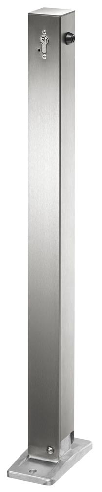 Edelstahl-Sperrpfosten, mit rechteckiger Bodenplatte zum Aufdübeln, kippbar, mit PZ-Schloss, Rohr eckig, 70x70 mm, mit Flachkopf, Höhe ü. Flur 900 mm