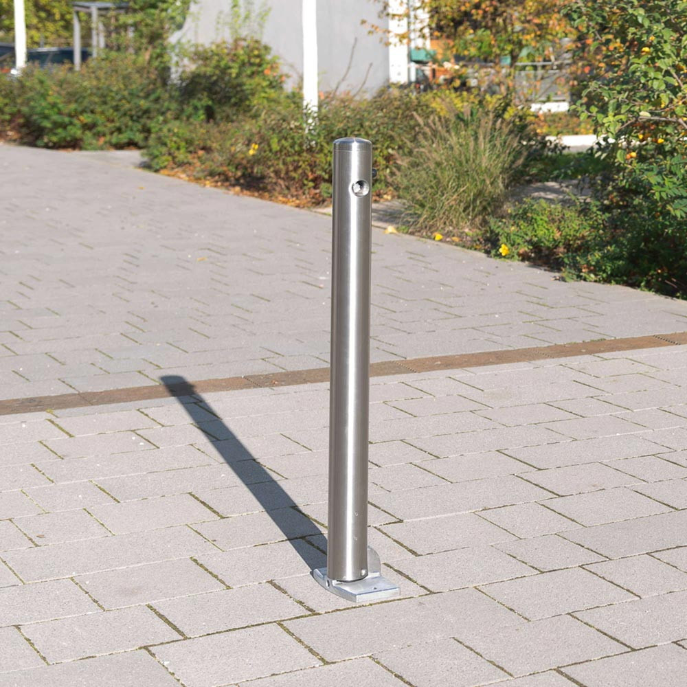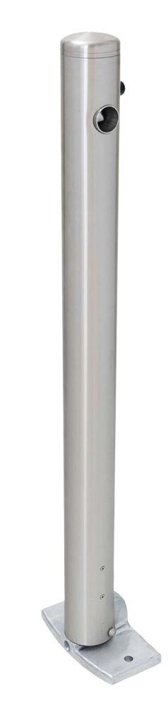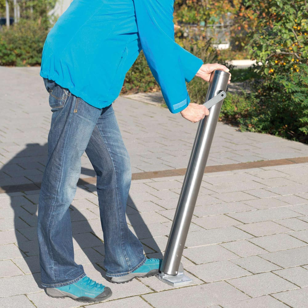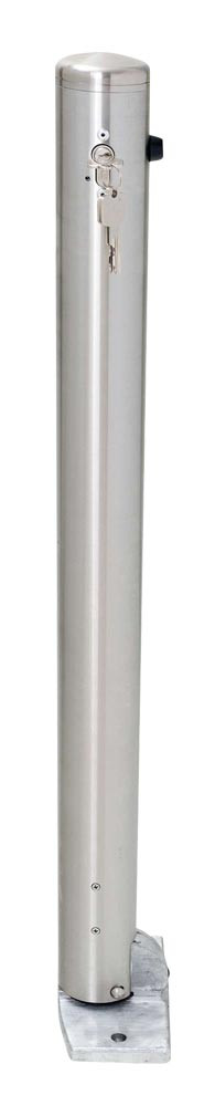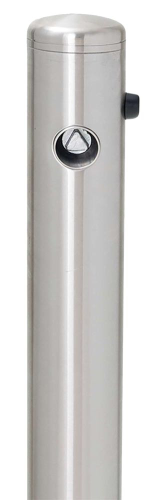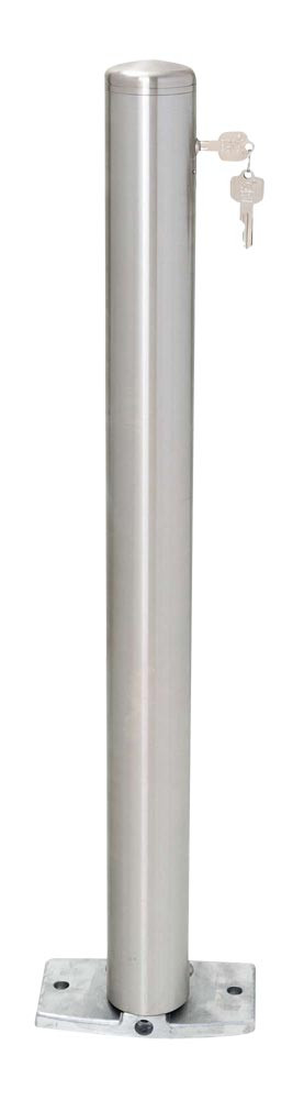· Edelstahl-Pfosten zum Umlegen · Ø 76 mm · Eingepresster Kappe, die mit einer umlaufenden Einkerbung abgesetzt ist · Höhe: 925 mm über Flur · Wahlweise mit Zylinderschloss oder Dreikantverschluss · Auf Anfrage auch mit Kettenösen erhältlich