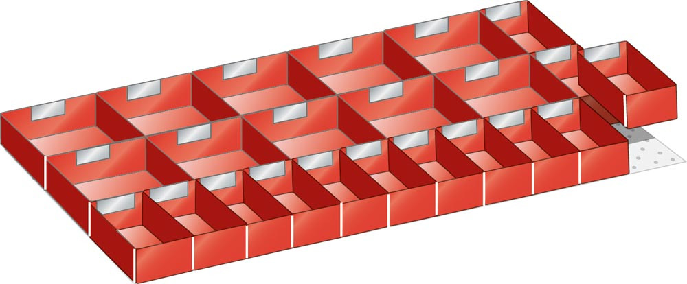 ∙ 10 Einsatzkästen: 150 x 150 x 71 mm, 13 Einsatzkästen: 150 x 75 x 71 mm, 1 Distanzwinkel