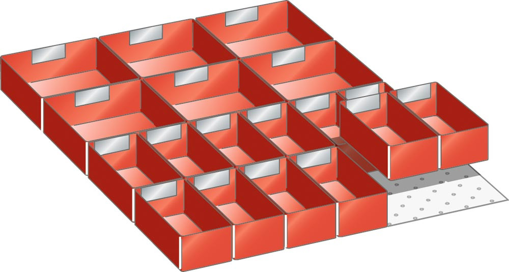 Einsatzkästen, Fronthöhe 100 mm, 12 Kästen 150x75 mm, 6 Kästen 150x150 mm,Schubladennutzgröße BxT 459x612 mm