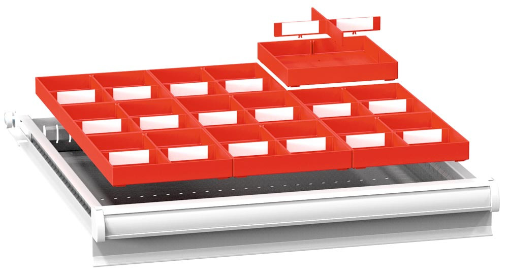 Einteilungsmaterial-Set, 9 Boxen 153x153x25 mm, 9 große Trenneinsätze, 18 kleine Trenneinsätze, für FH 75 mm, passend für Gehäusegröße BxT 578x600 mm E1985127