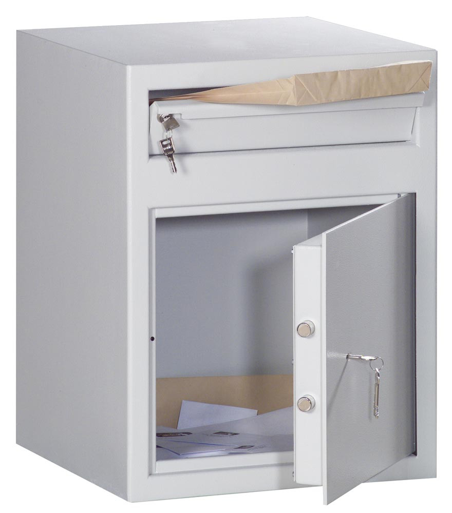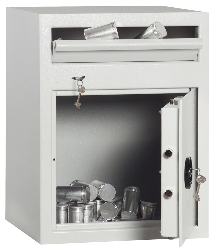 ∙ Leichte Ausführung ∙ Mit Einwurfklappe 3 mm stark und Zylinderschloss in Frontseite oben ∙ Beim Schließen der Klappe fällt das eingelegte Material in den Tresor, eine Rückholsicherung verhindert die nochmalige Entnahme∙ Einwandiger Korpus 3 mm stark, Tür doppelwandig 45 mm stark, Türblatt 6 mm stark ∙ Doppelbart-Sicherheitsschloss inklusive zwei Schlüsseln · Rückwand und Boden mit je zwei Bohrungen für Verankerung ∙ Lackierung in RAL 7035 lichtgrau