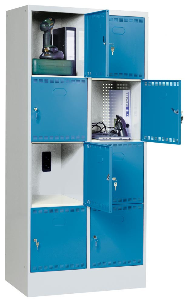 · Hochwertig verschweißte Stahlkonstruktion · Äußerst stabile Türen durch gewölbte Oberfläche (bombiert), mit Lochung unten und oben zur Belüftung, rechts angeschlagen · Je Tür ein Zylinderschloss mit 2 Schlüsseln · Innenausstattung je Fach: Energiemodul mit 2 Steckdosen 230 Volt