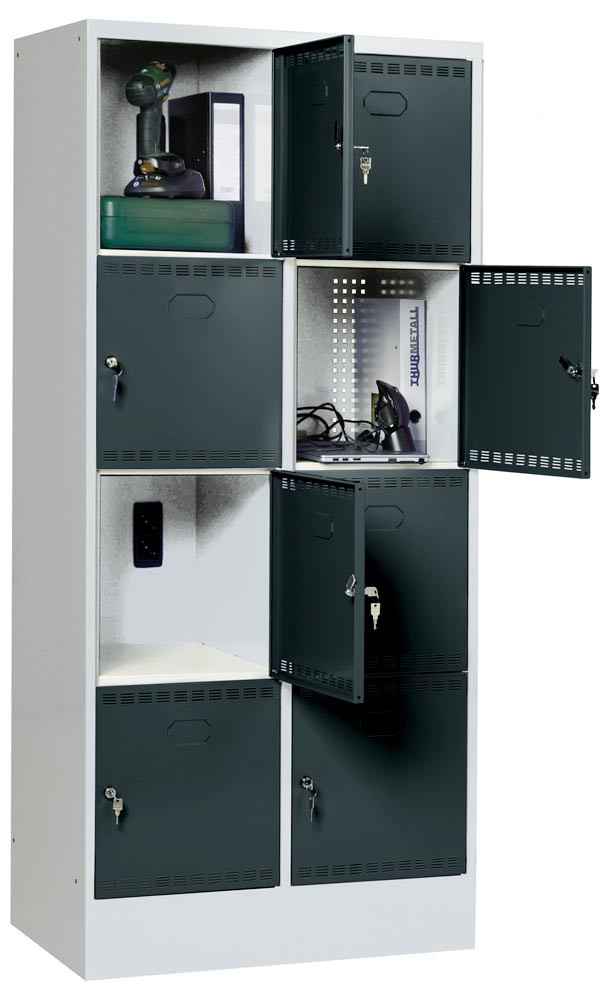 · Hochwertig verschweißte Stahlkonstruktion · Äußerst stabile Türen durch gewölbte Oberfläche (bombiert), mit Lochung unten und oben zur Belüftung, rechts angeschlagen · Je Tür ein Zylinderschloss mit 2 Schlüsseln · Innenausstattung je Fach: Energiemodul mit 2 Steckdosen 230 Volt