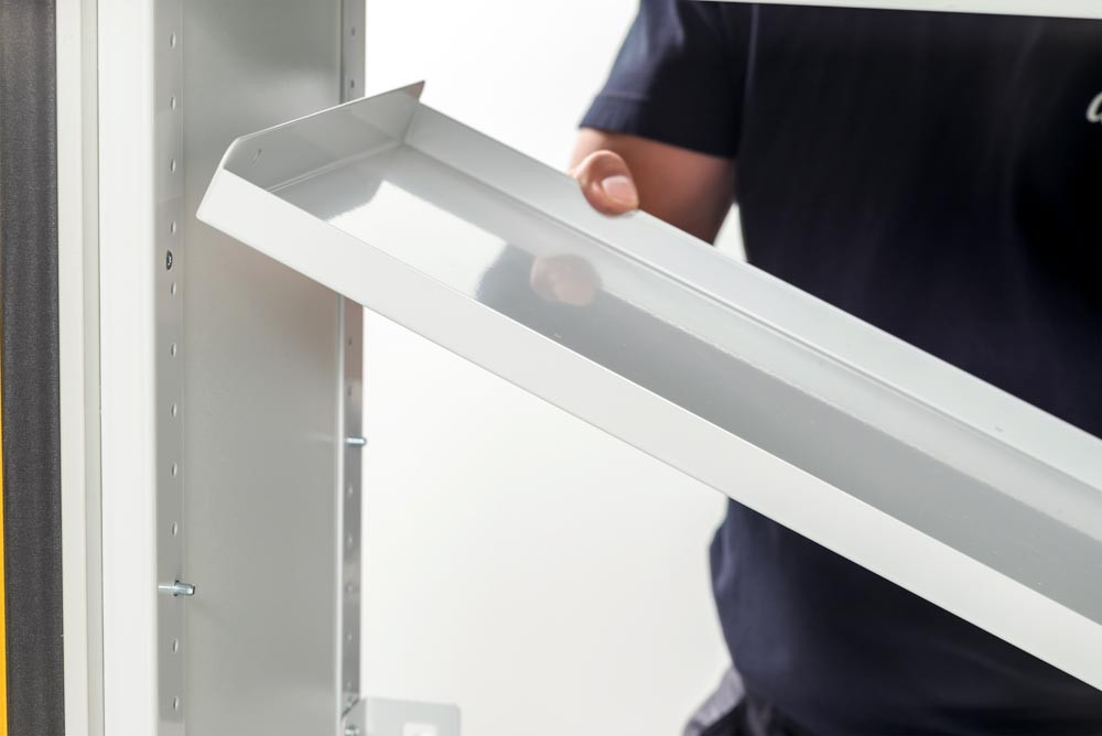 ∙ Stahlblech pulverbeschichtet RAL 7035 lichtgrau ∙ B x T x H 316 x 719 x 35 mm ∙ Traglast 50 kg