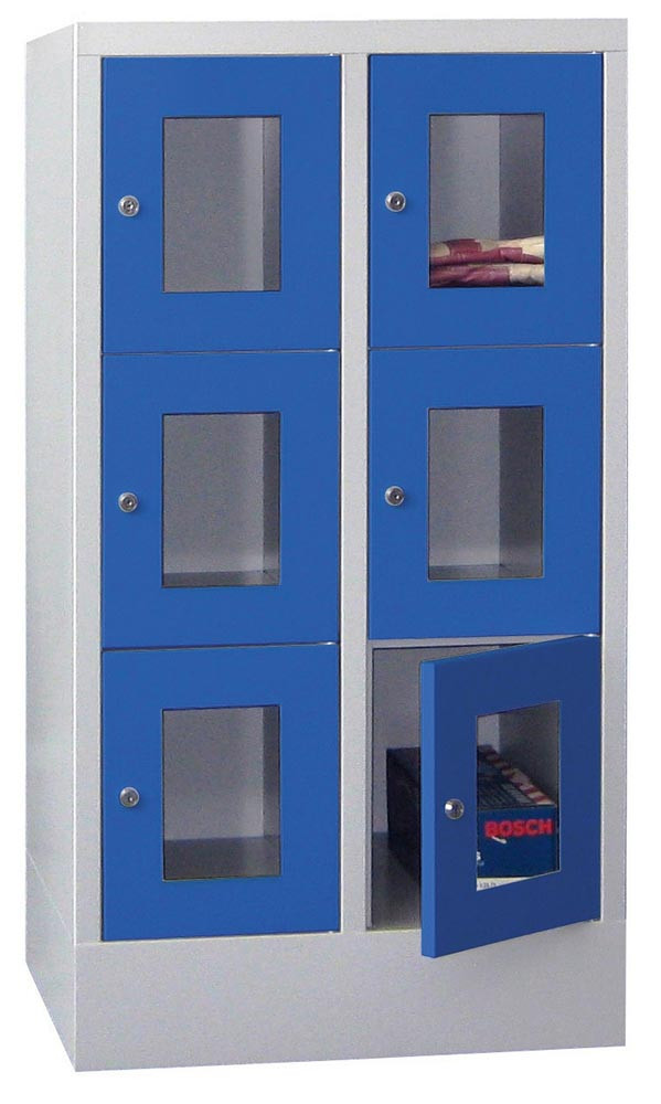 Fächerschränke mit Sichtfenstertüren, 2x3 Fächer, Schloss, BxTxH 600x500x1187 mm, Abt. B 300 mm, RAL 7035/5010