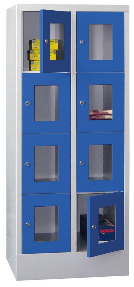 Fächerschränke mit Sichtfenstertüren, 2x4 Fächer, Schloss, BxTxH 600x500x1518 mm, Abt. B 300 mm, RAL 5010 E6422520