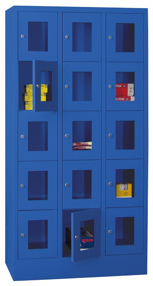 Fächerschränke mit Sichtfenstertüren, 3x5 Fächer, Schloss, BxTxH 900x500x1850 mm, Abt. B 300 mm, RAL 5010