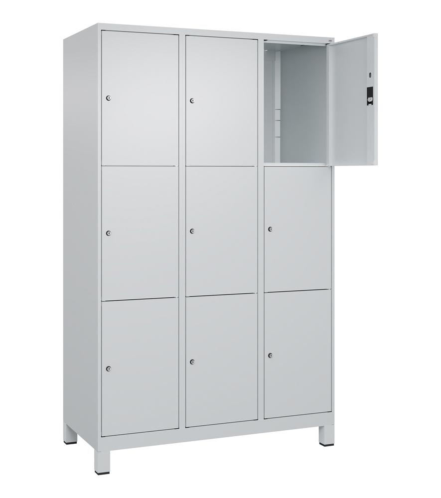 Fächerschrank, BxTxH 1200x500x1950 mm, 3x3 Fächer, Abt.B 400 mm, Füße, Schloss, glatte Türen, RAL 7035