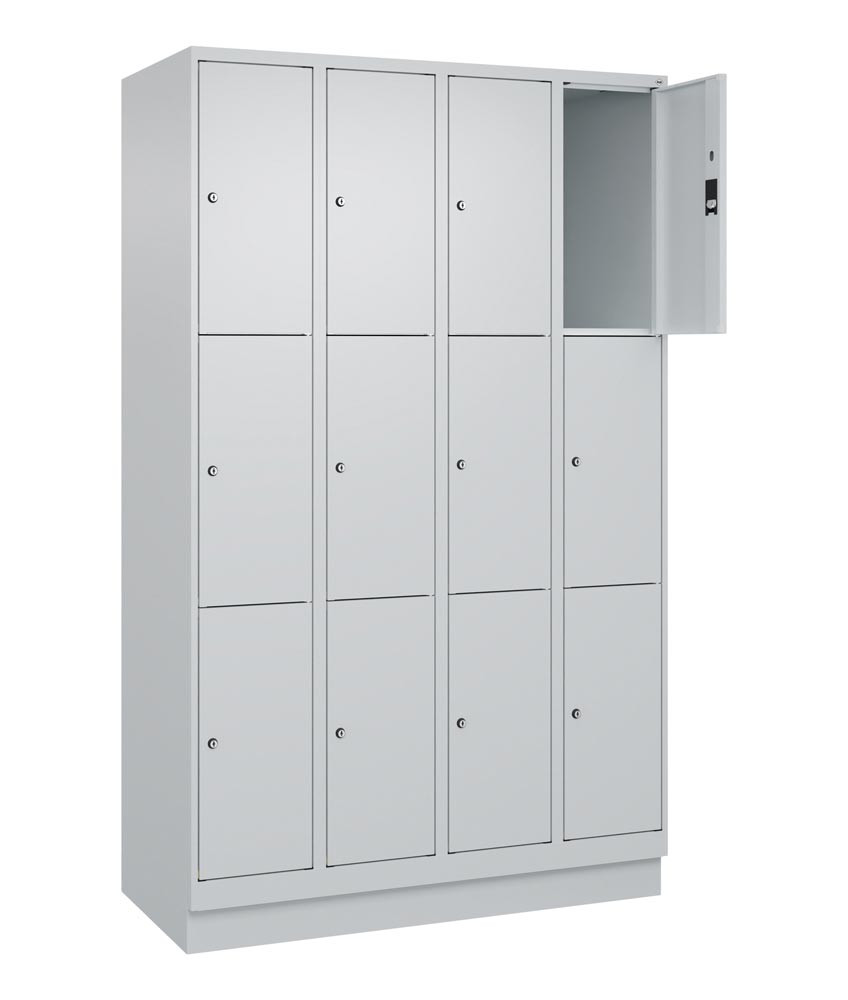 Fächerschrank, BxTxH 1200x500x1950 mm, 4x3 Fächer, Abt.B 300 mm, Sockel, Schloss, glatte Türen, RAL 7035