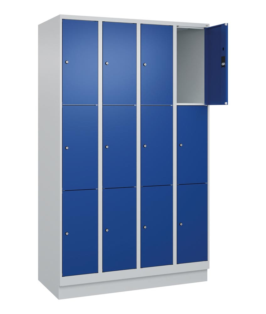 Fächerschrank, BxTxH 1200x500x1950 mm, 4x3 Fächer, Abt.B 300 mm, Sockel, Schloss, glatte Türen, RAL 7035/5010
