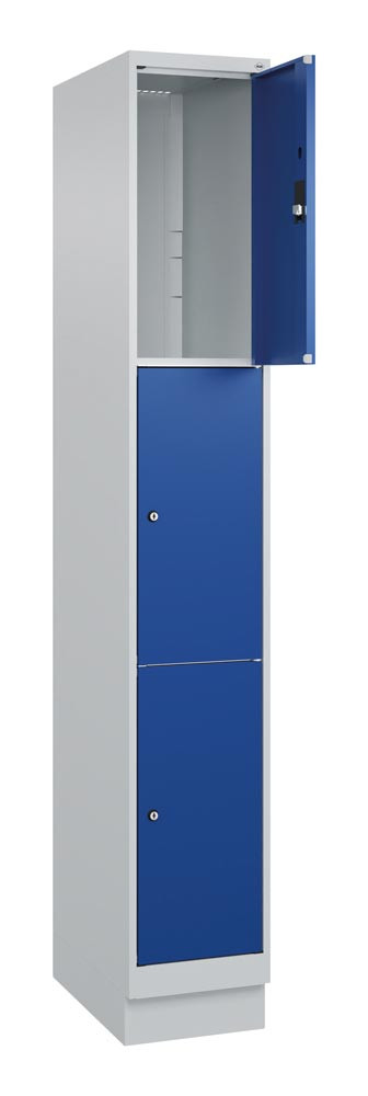 Fächerschrank, BxTxH 300x500x1950 mm, 1x3 Fächer, Abt.B 300 mm, Sockel, Schloss, glatte Türen, RAL 7035/5010 E6479246
