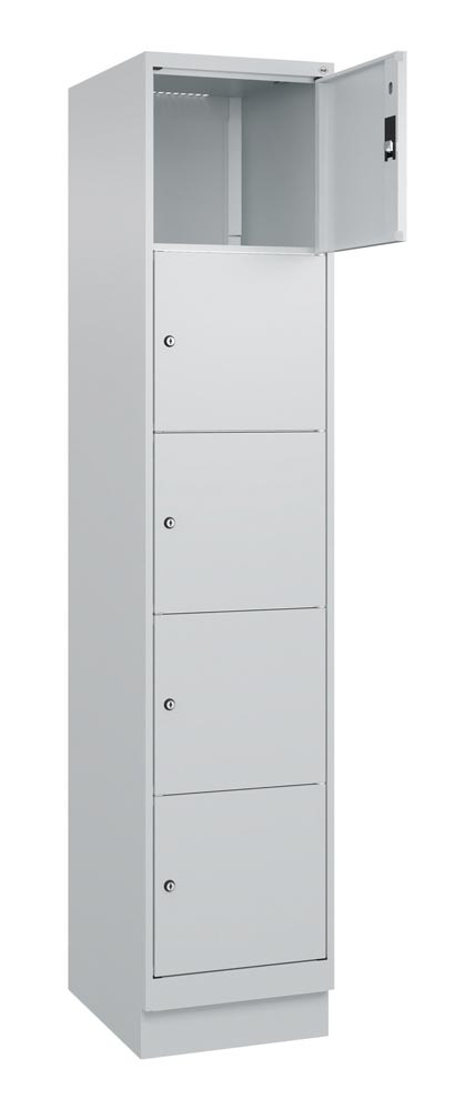 Fächerschrank, BxTxH 400x500x1950 mm, 1x5 Fächer, Abt.B 400 mm, Sockel, Schloss, glatte Türen, RAL 7035 E6479374