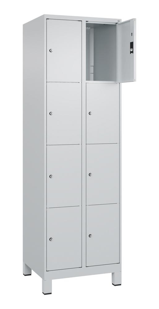 Fächerschrank, BxTxH 600x500x1950 mm, 2x4 Fächer, Abt.B 300 mm, Füße, Schloss, glatte Türen, RAL 7035