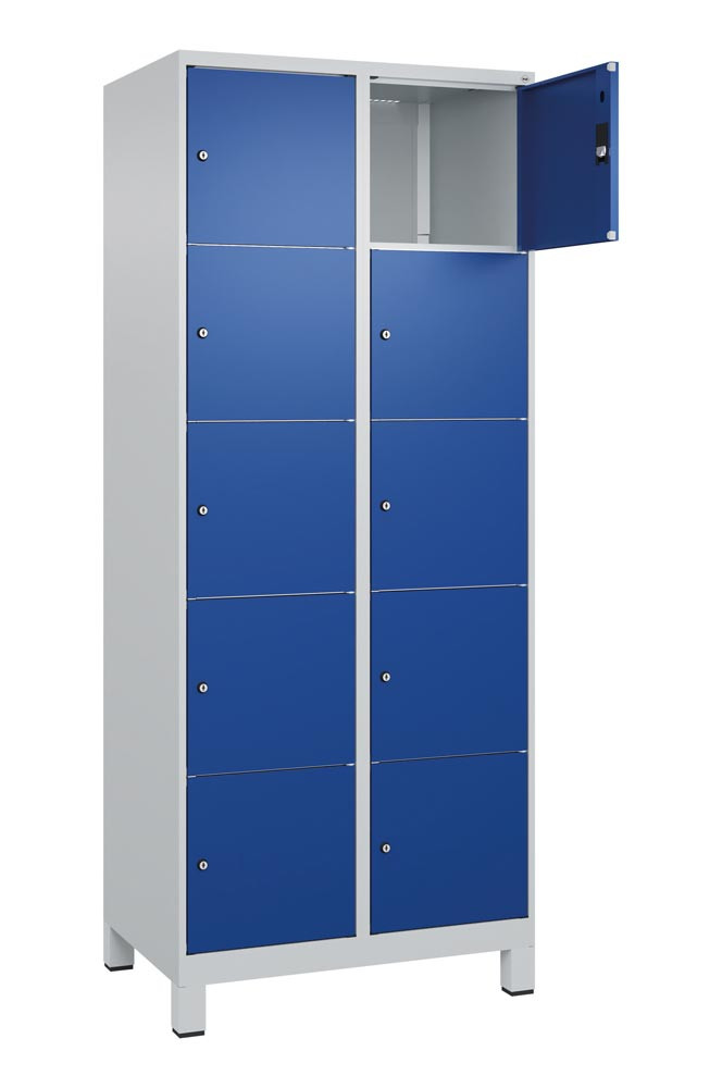 Fächerschrank, BxTxH 800x500x1950 mm, 2x5 Fächer, Abt.B 400 mm, Füße, Schloss, glatte Türen, RAL 7035/5010