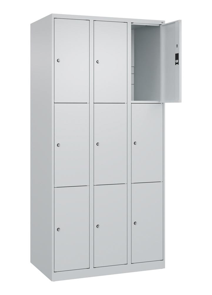 Fächerschrank, BxTxH 900x500x1850 mm, 3x3 Fächer, Abt.B 300 mm, bodenstehend, Schloss, glatte Türen, RAL 7035