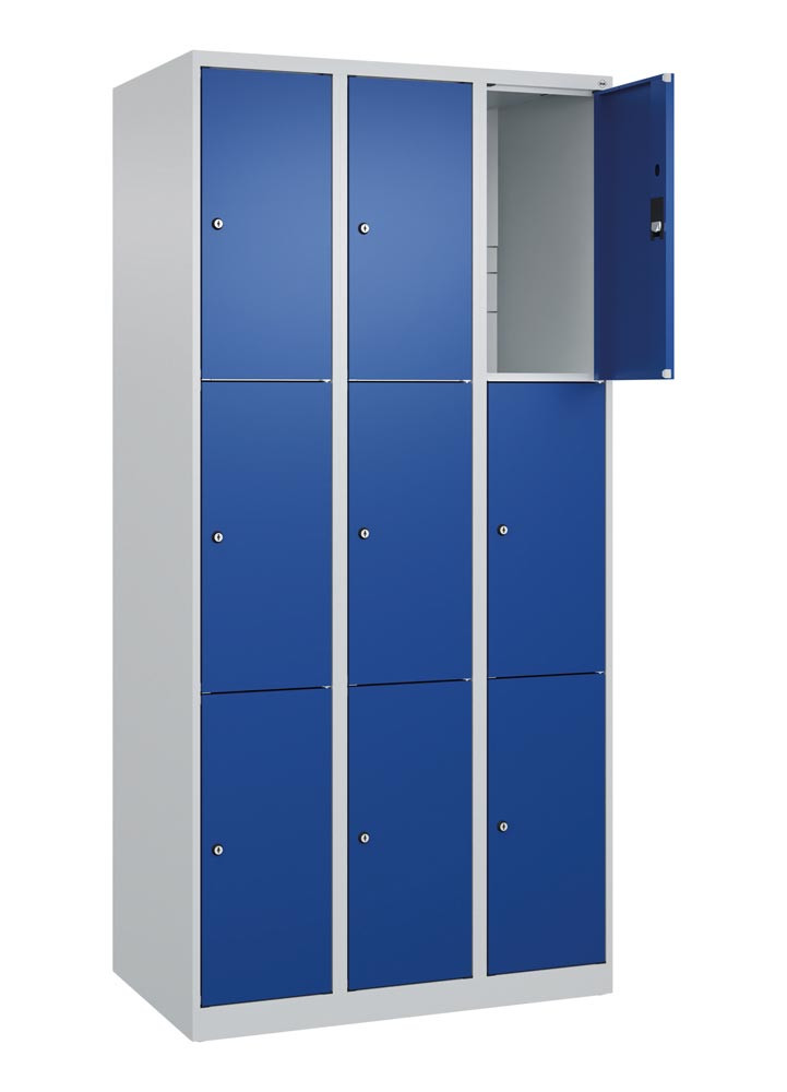 Fächerschrank, BxTxH 900x500x1850 mm, 3x3 Fächer, Abt.B 300 mm, bodenstehend, Schloss, glatte Türen, RAL 7035/5010