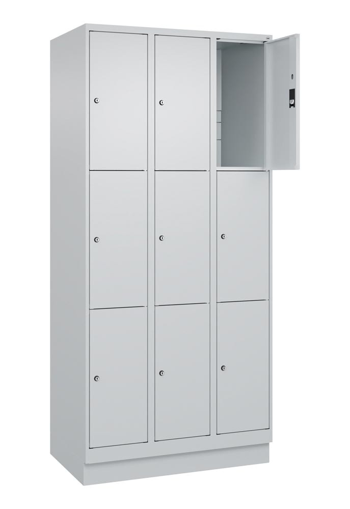 Fächerschrank, BxTxH 900x500x1950 mm, 3x3 Fächer, Abt.B 300 mm, Sockel, Schloss, glatte Türen, RAL 7035