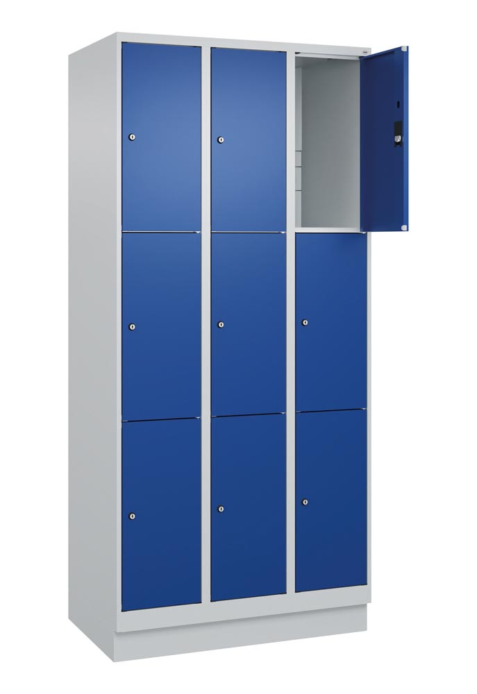 Fächerschrank, BxTxH 900x500x1950 mm, 3x3 Fächer, Abt.B 300 mm, Sockel, Schloss, glatte Türen, RAL 7035/5010