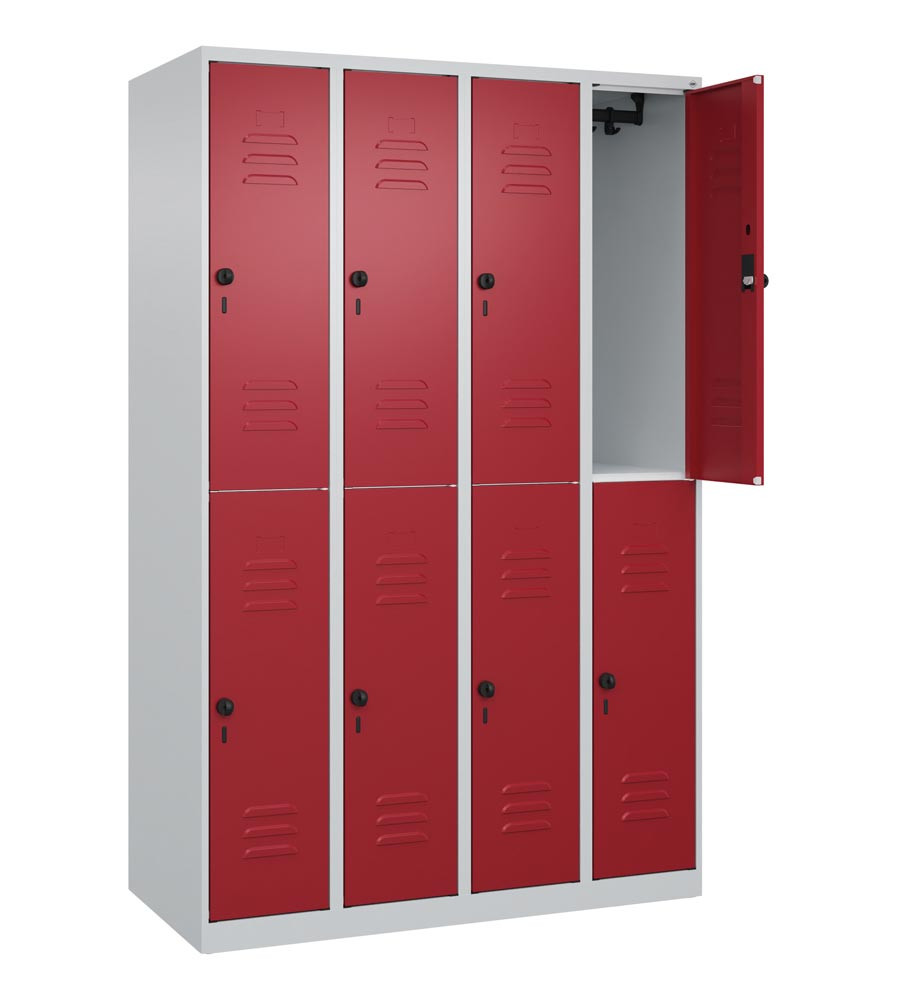 Fächerschrank, doppelstöckig, BxTxH 1200x500x1850 mm, 4x2 Fächer, Abt.B 300 mm, Drehriegel, bodenstehend, Farbwahl