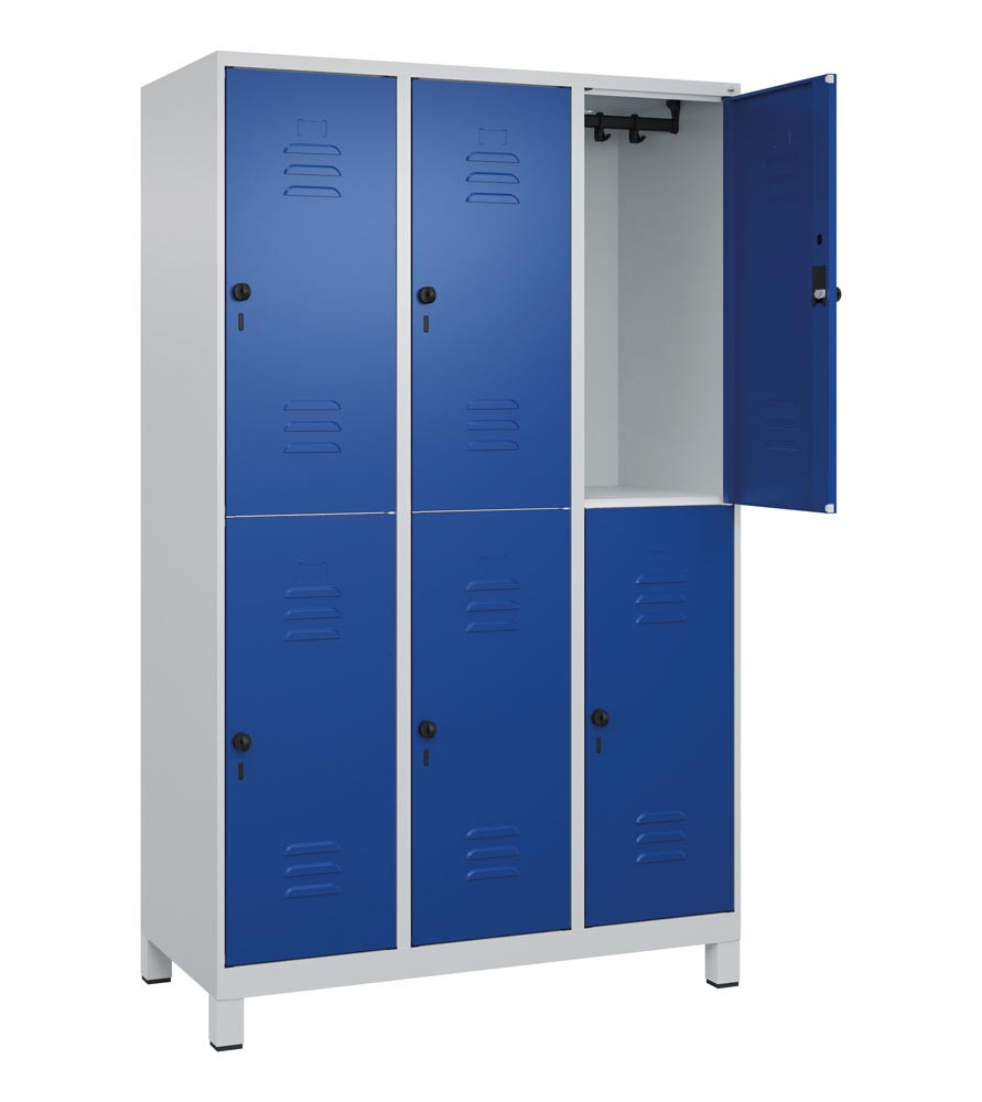 Fächerschrank, doppelstöckig, BxTxH 1200x500x1950 mm, 3x2 Fächer, Abt.B 400 mm, Drehriegel, Füße, RAL 7035/5010