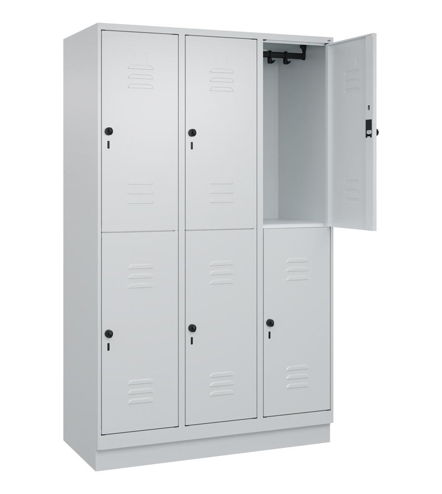Fächerschrank, doppelstöckig, BxTxH 1200x500x1950 mm, 3x2 Fächer, Abt.B 400 mm, Drehriegel, Sockel, RAL 7035