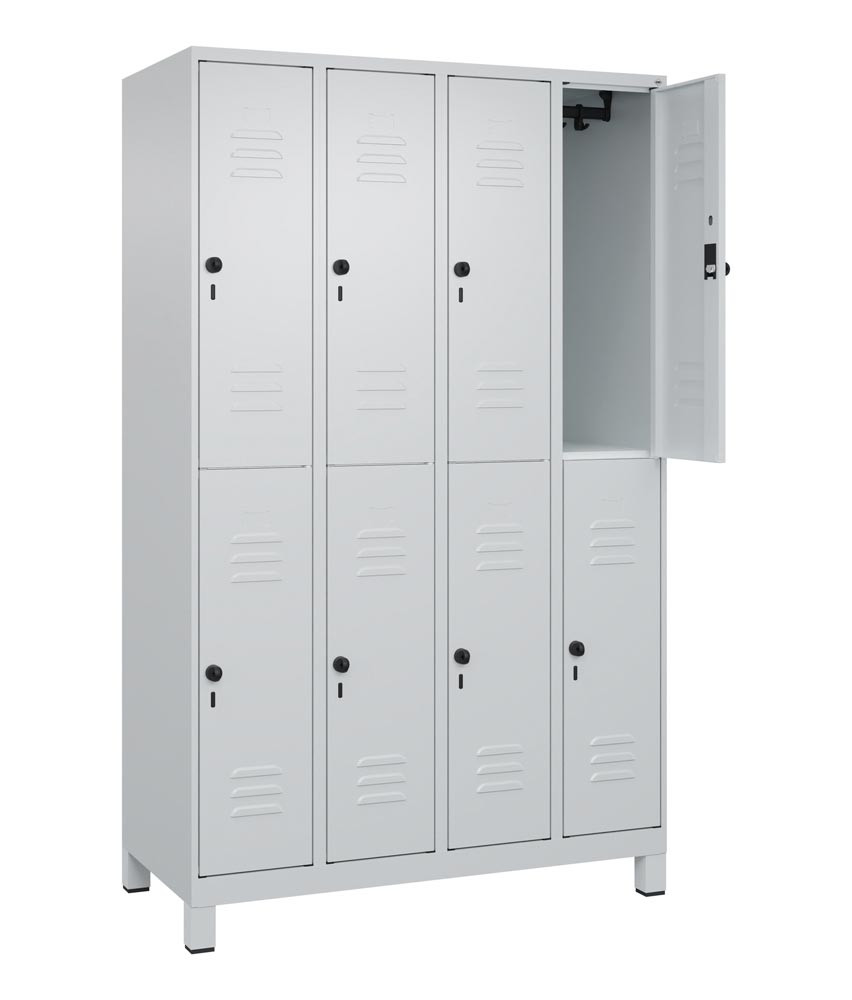 Fächerschrank, doppelstöckig, BxTxH 1200x500x1950 mm, 4x2 Fächer, Abt.B 300 mm, Drehriegel, Füße, RAL 7035