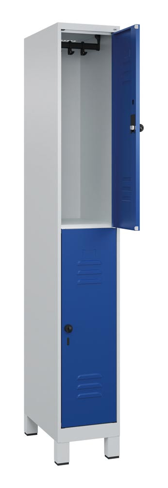 Fächerschrank, doppelstöckig, BxTxH 300x500x1950 mm, 1x2 Fächer, Abt.B 300 mm, Drehriegel, Füße, RAL 7035/5010 E6476671