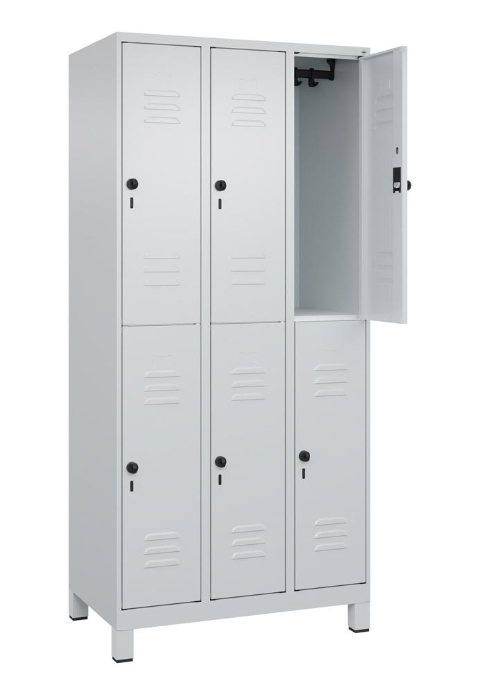 Fächerschrank, doppelstöckig, BxTxH 900x500x1950 mm, 3x2 Fächer, Abt.B 300 mm, Drehriegel, Füße, RAL 7035
