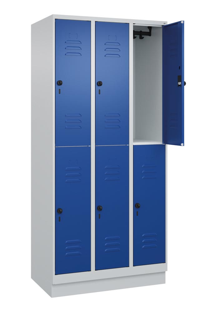 Fächerschrank, doppelstöckig, BxTxH 900x500x1950 mm, 3x2 Fächer, Abt.B 300 mm, Drehriegel, Sockel, RAL 7035/5010
