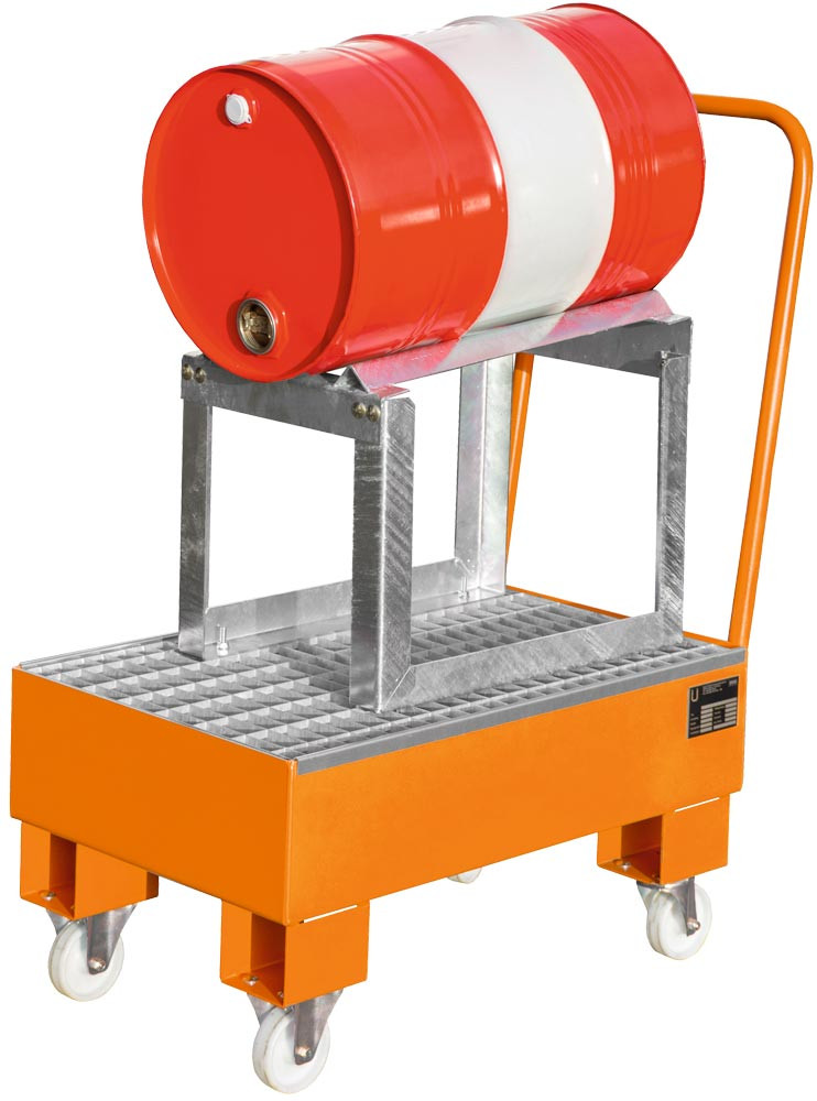 Fahrbare Auffangwanne für 1x60-l-Fass, 3 mm Stahlblech, liegend Lagern, BxTxH 940x500x1075 mm, Auffangvol. 61 l, RAL 2000 E6041851