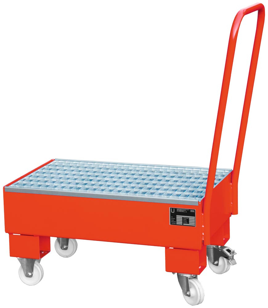 ∙ Mobile Lagerung von 60-l-Fässern ∙ Auffangwanne aus 3 mm Stahlblech inkl. verzinktem, herausnehmbaren Gitterrost ∙ Traglast 1000 kg/m2 ∙ Schiebegriff ∙ 2 Lenk- und 2 Bockrollen aus Polyamid Ø 100 mm, Bauhöhe 125 mm, davon 1 Lenkrolle mit Feststeller