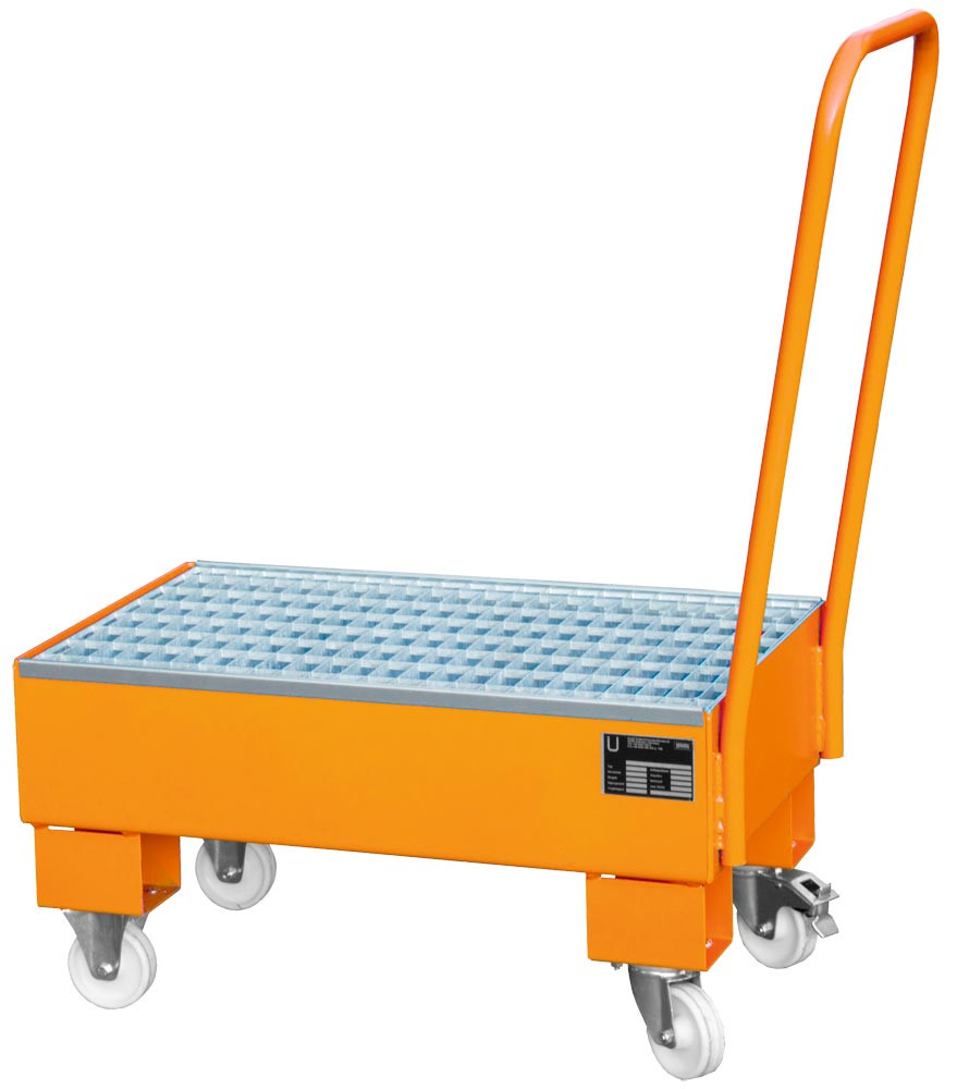 Fahrbare Auffangwanne für 2x60-l-Fass, 3 mm Stahlblech, stehend Lagern, BxTxH 940x500x1075 mm, Auffangvol. 61 l, RAL 2000 E6041845