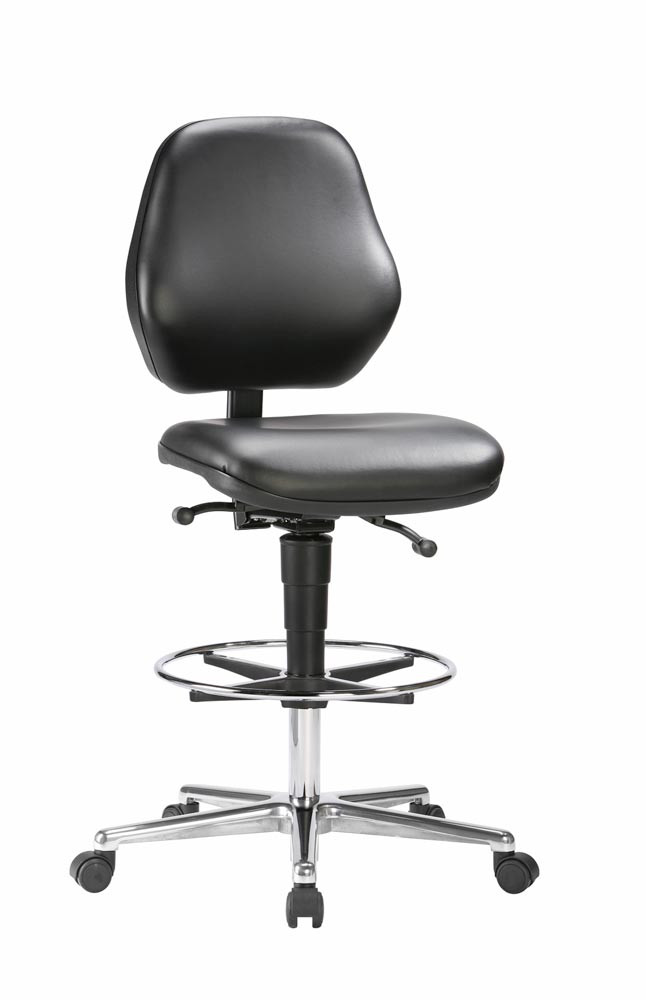 Hochstuhl · nach DIN 68877 · bedienungsfreundliche Gasfeder-Sitzhöheneinstellung · Sitz-Stopp-Rollen - standfest bei Belastung, rollbar im unbelasteten Zustand · ergonomisch geformter Sitz und Rückenlehne, mit integrierter Lendenwirbelstütze · stufenlos neigungs- und höhenverstellbare Rückenlehne · Fünffuß-Untergestell aus Aluminium, flach auslaufend, kipp- und stolpersicher · Sitz und Rückenlehne mit robustem, schwarzen Kunstlederbezug, leicht abwaschbar · Untergestell mit Sitz-Stopp-Rollen und mit höhenverstellbarem Fußring, verchromt
