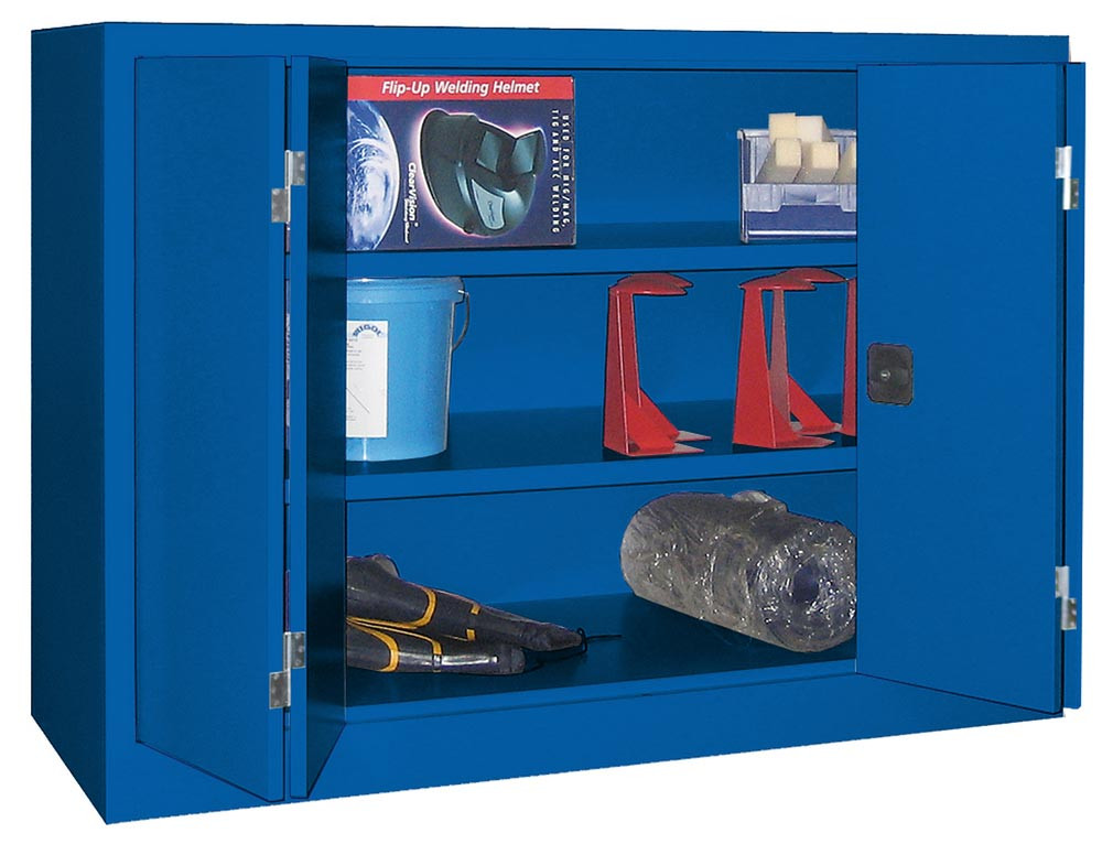 ∙ Stabile Stahlblechkonstruktion ∙ Oberfläche pulverbeschichtet ∙ Schränke mit gemeinsam verschließbaren Vollblech-Falttüren und Verstärkungstaschen ∙ Die Türen sind über einen dreiriegeligen Drehgriff mit integriertem Zylinderschloss inkl. 2 Schlüsseln verschließbar ∙ Böden im Raster von 17 mm höhenverstellbar, Belastbarkeit je Boden 80 kg bei gleichmäßig verteilter Last ∙ Max. Gehäusebelastbarkeit 600 kg