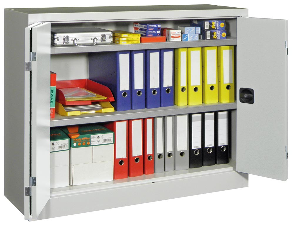 ∙ Stabile Stahlblechkonstruktion ∙ Oberfläche pulverbeschichtet ∙ Schränke mit gemeinsam verschließbaren Vollblech-Falttüren und Verstärkungstaschen ∙ Die Türen sind über einen dreiriegeligen Drehgriff mit integriertem Zylinderschloss inkl. 2 Schlüsseln verschließbar ∙ Böden im Raster von 17 mm höhenverstellbar, Belastbarkeit je Boden 80 kg bei gleichmäßig verteilter Last ∙ Max. Gehäusebelastbarkeit 600 kg