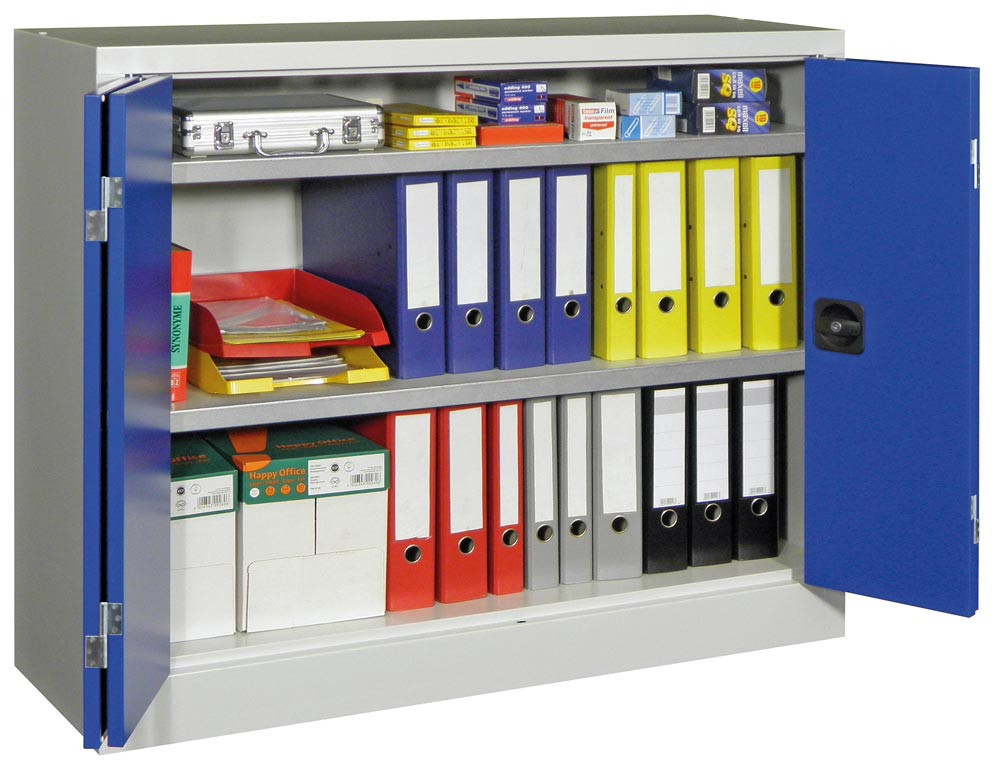 ∙ Stabile Stahlblechkonstruktion ∙ Oberfläche pulverbeschichtet ∙ Schränke mit gemeinsam verschließbaren Vollblech-Falttüren und Verstärkungstaschen ∙ Die Türen sind über einen dreiriegeligen Drehgriff mit integriertem Zylinderschloss inkl. 2 Schlüsseln verschließbar ∙ Böden im Raster von 17 mm höhenverstellbar, Belastbarkeit je Boden 80 kg bei gleichmäßig verteilter Last ∙ Max. Gehäusebelastbarkeit 600 kg