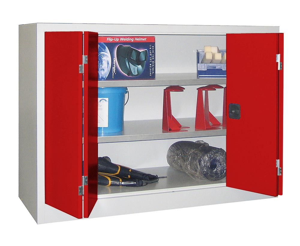 ∙ Stabile Stahlblechkonstruktion ∙ Oberfläche pulverbeschichtet ∙ Schränke mit gemeinsam verschließbaren Vollblech-Falttüren und Verstärkungstaschen ∙ Die Türen sind über einen dreiriegeligen Drehgriff mit integriertem Zylinderschloss inkl. 2 Schlüsseln verschließbar ∙ Böden im Raster von 17 mm höhenverstellbar, Belastbarkeit je Boden 80 kg bei gleichmäßig verteilter Last ∙ Max. Gehäusebelastbarkeit 600 kg