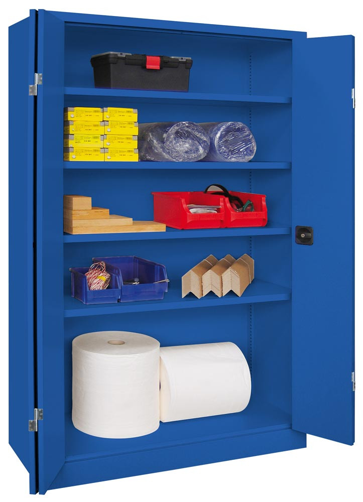 ∙ Stabile Stahlblechkonstruktion ∙ Oberfläche pulverbeschichtet ∙ Schränke mit gemeinsam verschließbaren Vollblech-Falttüren und Verstärkungstaschen ∙ Die Türen sind über einen dreiriegeligen Drehgriff mit integriertem Zylinderschloss inkl. 2 Schlüsseln verschließbar ∙ Böden im Raster von 17 mm höhenverstellbar, Belastbarkeit je Boden 80 kg bei gleichmäßig verteilter Last ∙ Max. Gehäusebelastbarkeit 600 kg