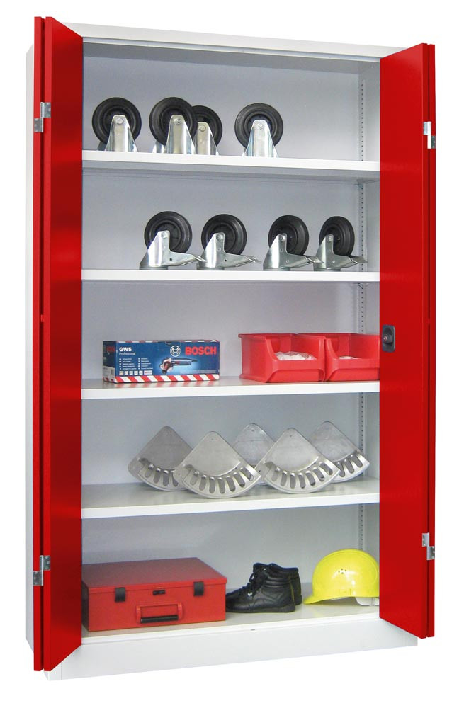 ∙ Stabile Stahlblechkonstruktion ∙ Oberfläche pulverbeschichtet ∙ Schränke mit gemeinsam verschließbaren Vollblech-Falttüren und Verstärkungstaschen ∙ Die Türen sind über einen dreiriegeligen Drehgriff mit integriertem Zylinderschloss inkl. 2 Schlüsseln verschließbar ∙ Böden im Raster von 17 mm höhenverstellbar, Belastbarkeit je Boden 80 kg bei gleichmäßig verteilter Last ∙ Max. Gehäusebelastbarkeit 600 kg