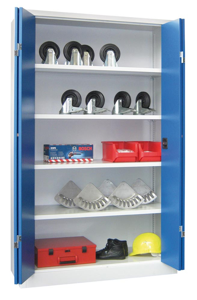 ∙ Stabile Stahlblechkonstruktion ∙ Oberfläche pulverbeschichtet ∙ Schränke mit gemeinsam verschließbaren Vollblech-Falttüren und Verstärkungstaschen ∙ Die Türen sind über einen dreiriegeligen Drehgriff mit integriertem Zylinderschloss inkl. 2 Schlüsseln verschließbar ∙ Böden im Raster von 17 mm höhenverstellbar, Belastbarkeit je Boden 80 kg bei gleichmäßig verteilter Last ∙ Max. Gehäusebelastbarkeit 600 kg
