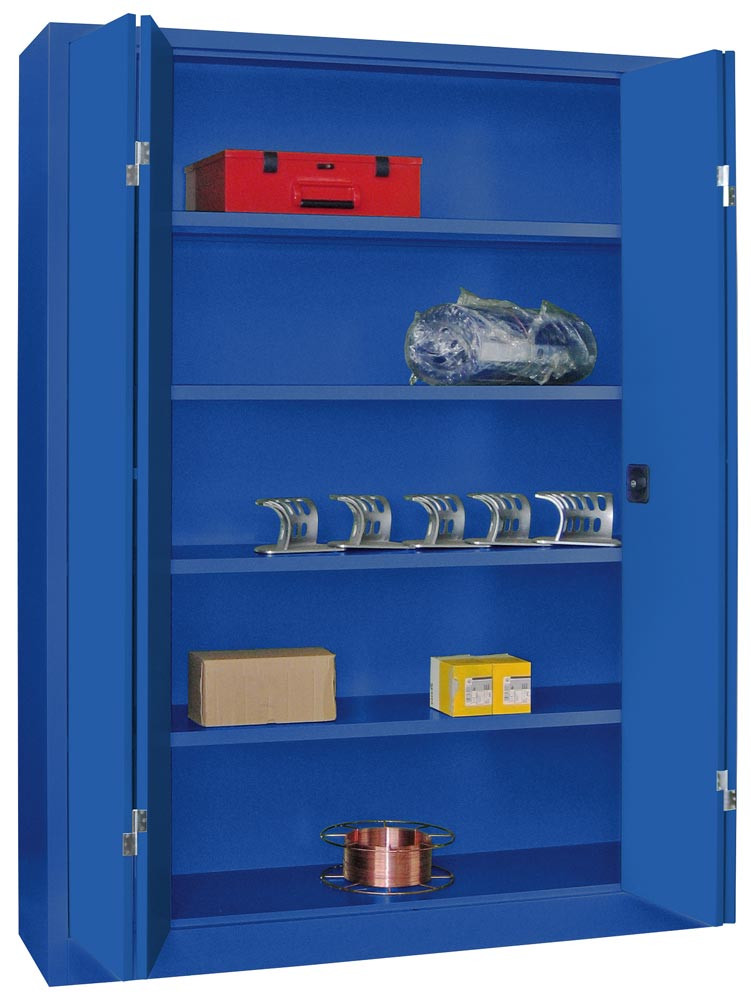 ∙ Stabile Stahlblechkonstruktion ∙ Oberfläche pulverbeschichtet ∙ Schränke mit gemeinsam verschließbaren Vollblech-Falttüren und Verstärkungstaschen ∙ Die Türen sind über einen dreiriegeligen Drehgriff mit integriertem Zylinderschloss inkl. 2 Schlüsseln verschließbar ∙ Böden im Raster von 17 mm höhenverstellbar, Belastbarkeit je Boden 80 kg bei gleichmäßig verteilter Last ∙ Max. Gehäusebelastbarkeit 600 kg