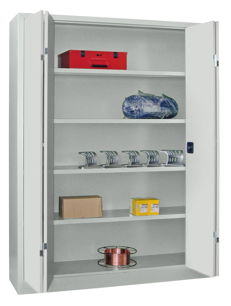 ∙ Stabile Stahlblechkonstruktion ∙ Oberfläche pulverbeschichtet ∙ Schränke mit gemeinsam verschließbaren Vollblech-Falttüren und Verstärkungstaschen ∙ Die Türen sind über einen dreiriegeligen Drehgriff mit integriertem Zylinderschloss inkl. 2 Schlüsseln verschließbar ∙ Böden im Raster von 17 mm höhenverstellbar, Belastbarkeit je Boden 80 kg bei gleichmäßig verteilter Last ∙ Max. Gehäusebelastbarkeit 600 kg