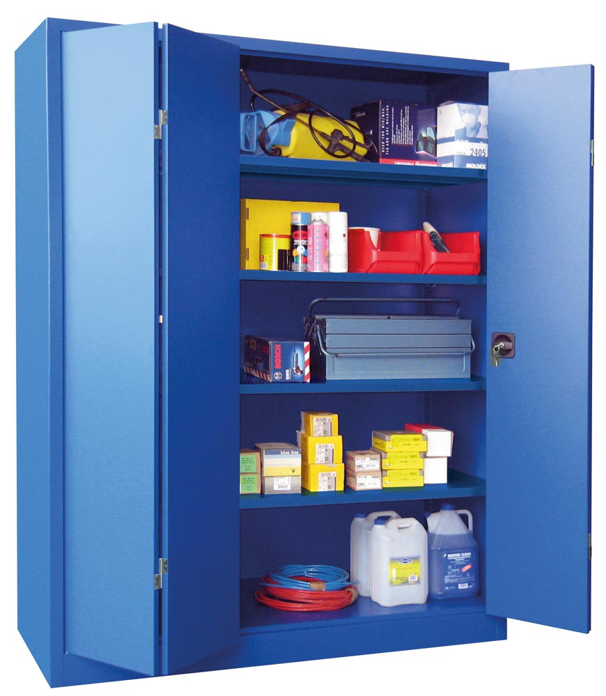 ∙ Stabile Stahlblechkonstruktion ∙ Oberfläche pulverbeschichtet ∙ Schränke mit gemeinsam verschließbaren Vollblech-Falttüren und Verstärkungstaschen ∙ Die Türen sind über einen dreiriegeligen Drehgriff mit integriertem Zylinderschloss inkl. 2 Schlüsseln verschließbar ∙ Böden im Raster von 17 mm höhenverstellbar, Belastbarkeit je Boden 80 kg bei gleichmäßig verteilter Last ∙ Max. Gehäusebelastbarkeit 600 kg