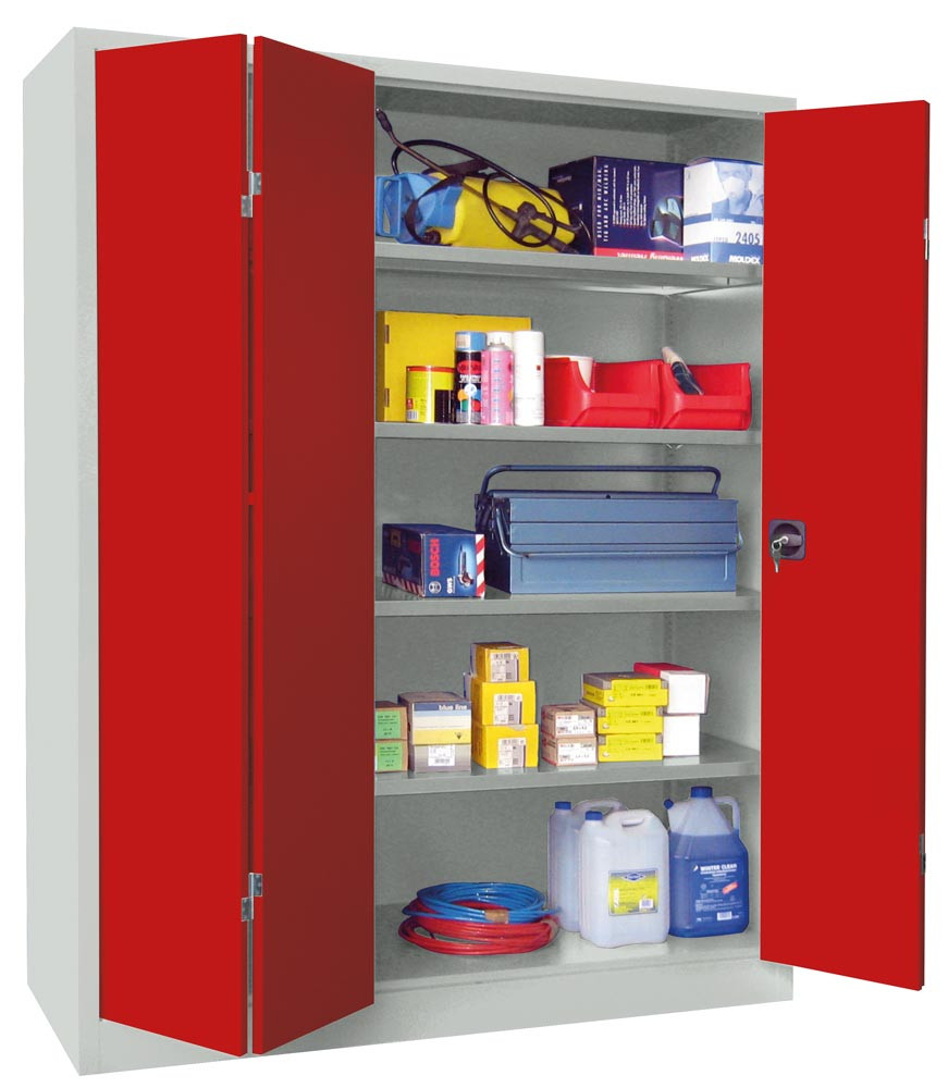 ∙ Stabile Stahlblechkonstruktion ∙ Oberfläche pulverbeschichtet ∙ Schränke mit gemeinsam verschließbaren Vollblech-Falttüren und Verstärkungstaschen ∙ Die Türen sind über einen dreiriegeligen Drehgriff mit integriertem Zylinderschloss inkl. 2 Schlüsseln verschließbar ∙ Böden im Raster von 17 mm höhenverstellbar, Belastbarkeit je Boden 80 kg bei gleichmäßig verteilter Last ∙ Max. Gehäusebelastbarkeit 600 kg