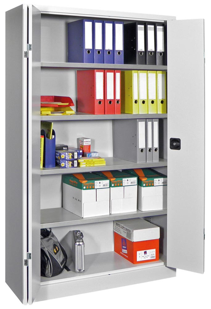∙ Stabile Stahlblechkonstruktion ∙ Oberfläche pulverbeschichtet ∙ Schränke mit gemeinsam verschließbaren Vollblech-Falttüren und Verstärkungstaschen ∙ Die Türen sind über einen dreiriegeligen Drehgriff mit integriertem Zylinderschloss inkl. 2 Schlüsseln verschließbar ∙ Böden im Raster von 17 mm höhenverstellbar, Belastbarkeit je Boden 80 kg bei gleichmäßig verteilter Last ∙ Max. Gehäusebelastbarkeit 600 kg