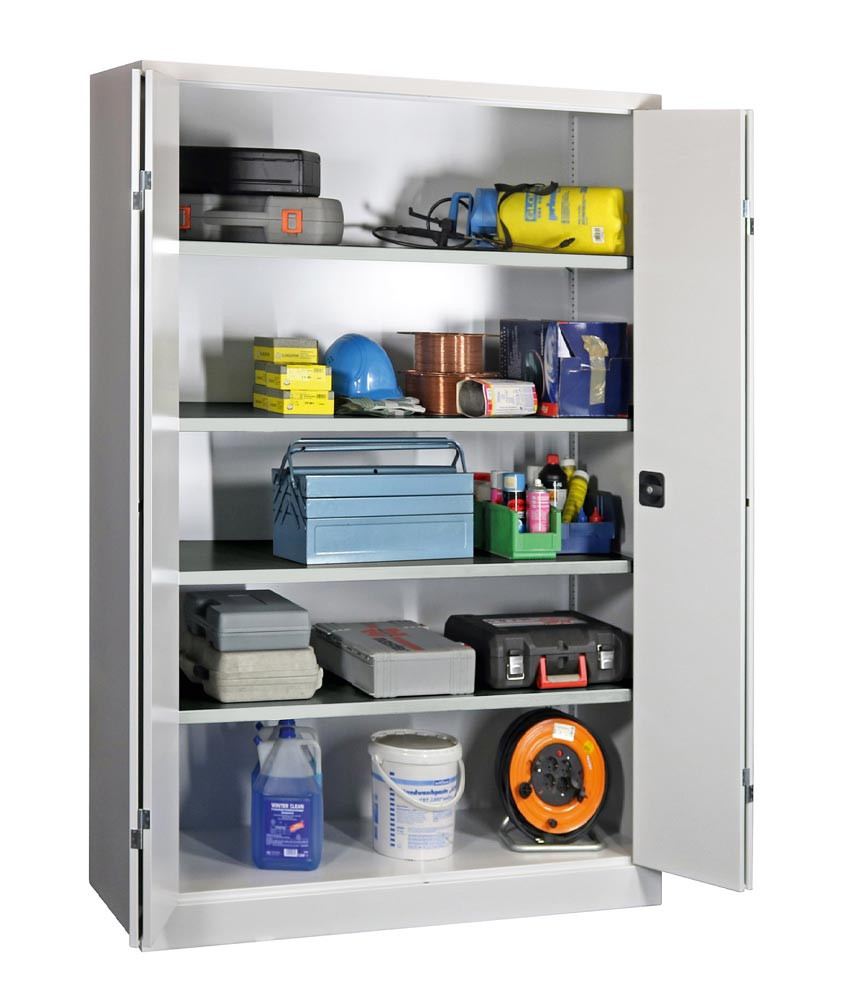 ∙ Stabile Stahlblechkonstruktion ∙ Oberfläche pulverbeschichtet ∙ Schränke mit gemeinsam verschließbaren Vollblech-Falttüren und Verstärkungstaschen ∙ Die Türen sind über einen dreiriegeligen Drehgriff mit integriertem Zylinderschloss inkl. 2 Schlüsseln verschließbar ∙ Böden im Raster von 17 mm höhenverstellbar, Belastbarkeit je Boden 80 kg bei gleichmäßig verteilter Last ∙ Max. Gehäusebelastbarkeit 600 kg